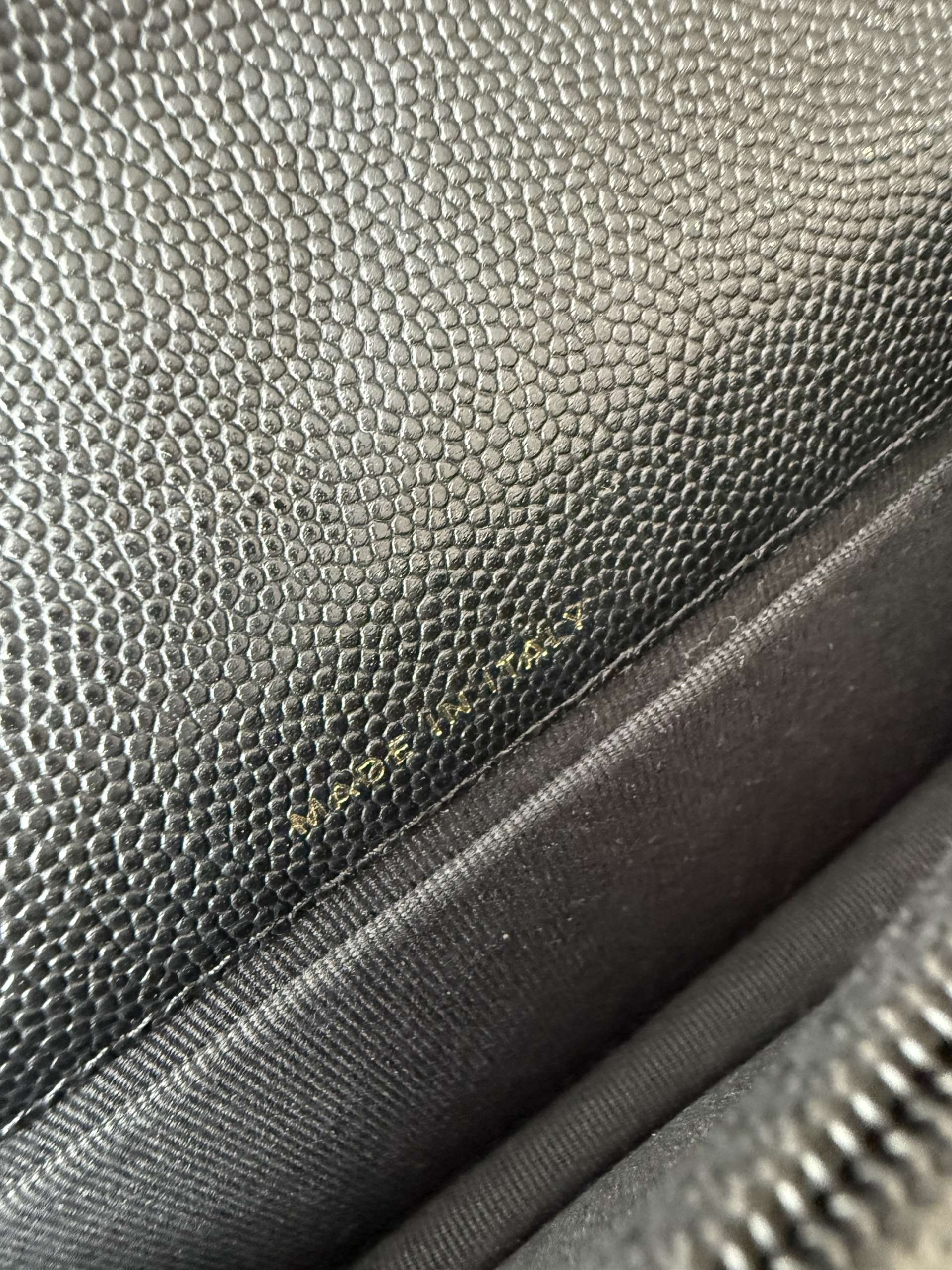 · Condition is nearly brand new. Crafted from caviar leather with gold-tone hardware. Phone cannot fit inside. Features the original metal chain strap.