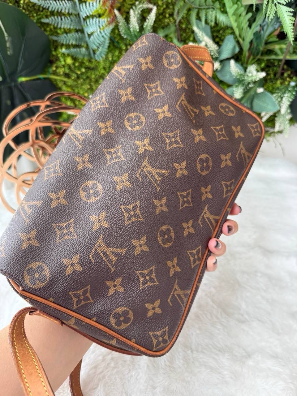 · Minor speckled marks on the front. Hardware is in good overall condition. Leather has no cracks or water stains. Adjustable shoulder strap.